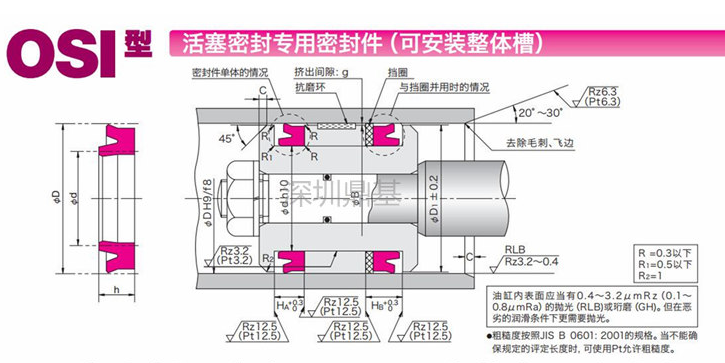 OSI型活塞杆密封 具有较小的截面,可装入整体槽,使用的聚氨酯材料具有很好的耐磨性。